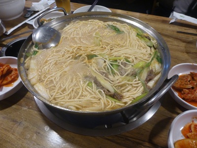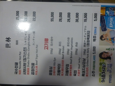 下記の写真は「長安門」のメニューとメニューの一番上の「スペアリブの蒸し物(トゥンカルビチム)」 (中は25000ウォン、大は35000ウォン) 、「世林」のメニューとオーダーしたメニューの一番上の「麺鍋(ククスジョンゴル)」です。最後にご飯を入れ、雑炊も出ます。お店の人が料理をしてくれます。ソウルのサラリーマンの居酒屋で安い料理を堪能してください。