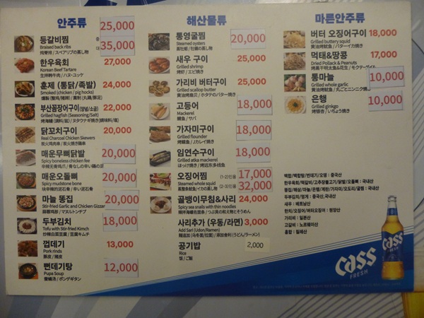 長安門のメニューです。「スペアリブの蒸しもの」中は二人前でしょう。オイスターもおすすめです。周りを眺めていると、ビールと焼酎を混ぜて飲むようです。小生韓国のビールだけ、もしくは焼酎だけです。混ぜては飲みません。メニューは二人前と考えて、注文してください。