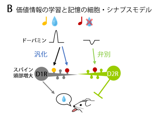 予想外に報酬を得たとき、ドーパミンが一過的に上昇し、D1受容体を介して報酬の学習が強化されます。